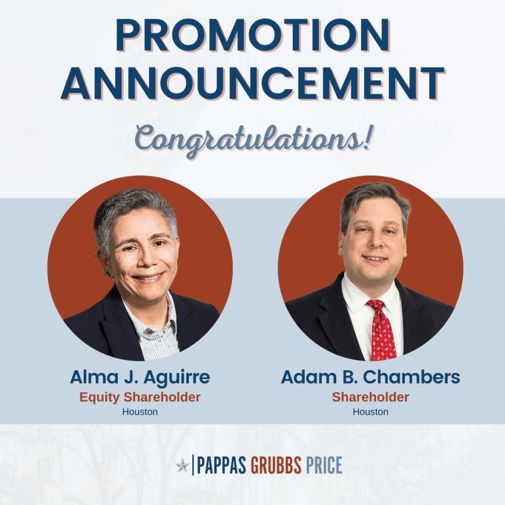 We are pleased to congratulate Alma Aguirre on her promotion to Equity Shareholder and Adam Chambers on his promotion from Of Counsel to Shareholder!